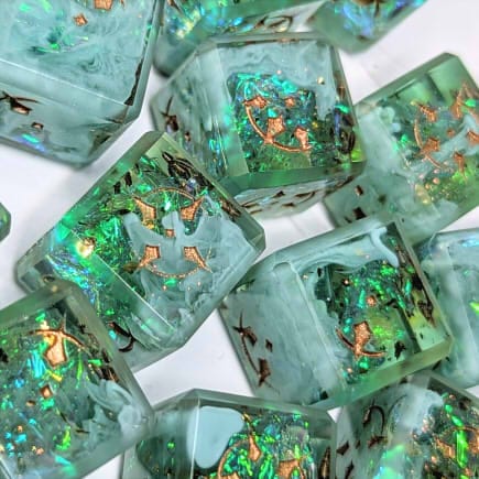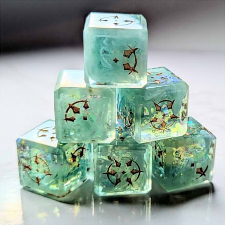Set of 6d6. Teal green dice packed with brightly flashing mylar and swirls of light blue clouds, accented with flashes of gold and copper glitter, inked in copper.