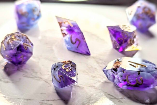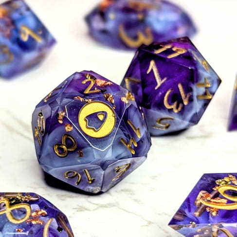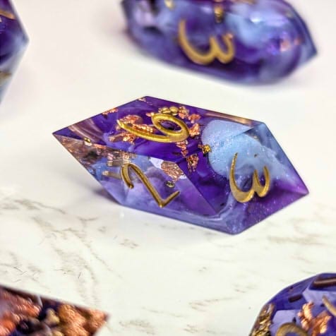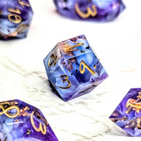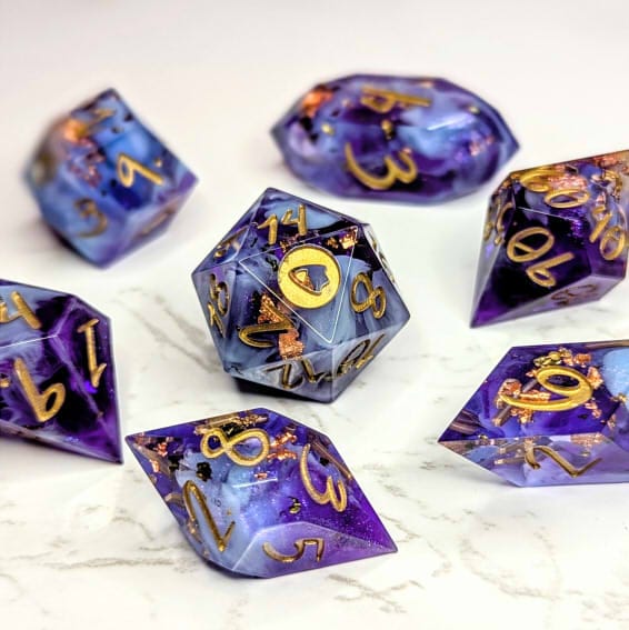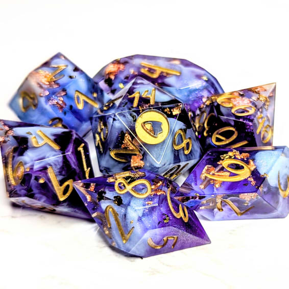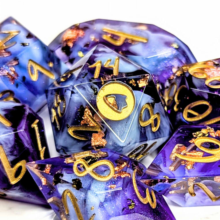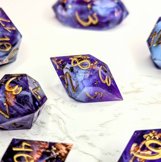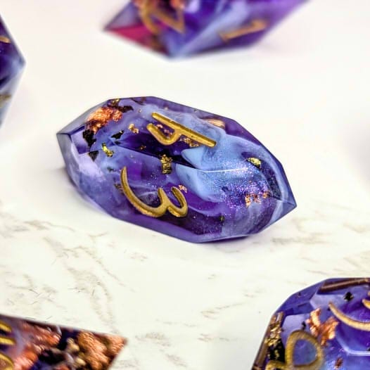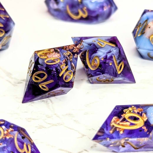 Warm purple dice packed with multicolor metallic flakes, waves of shimmery colorshift, and fluffy light blue bloops, inked in gold.