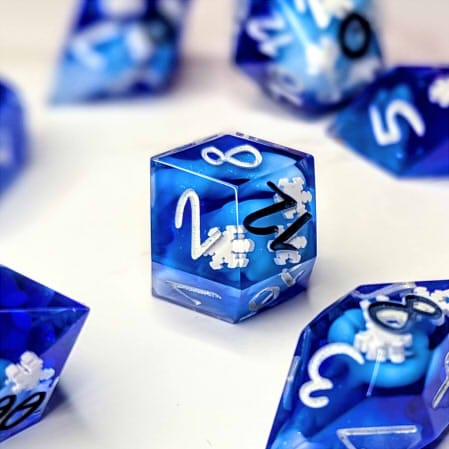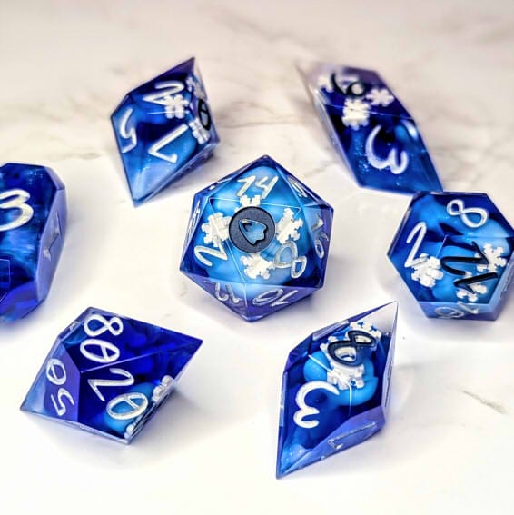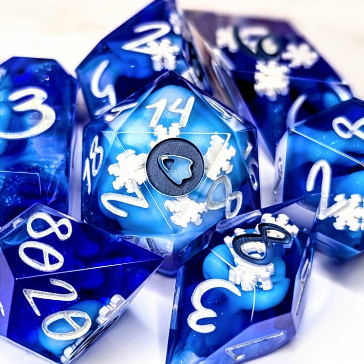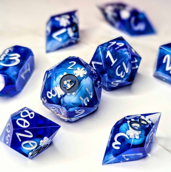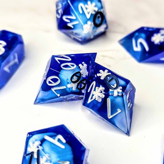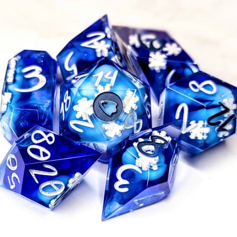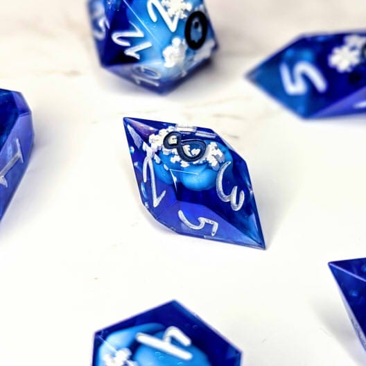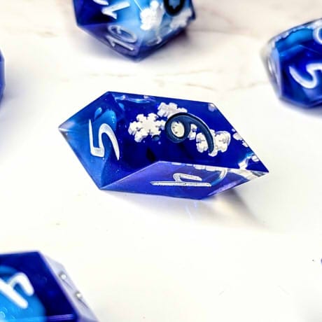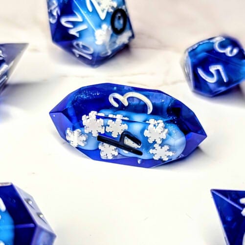 Deep blue dice with chunky snowflake inclusions suspended on a shimmery pillow of white, inked in pearlescent white with the high faces in navy blue.