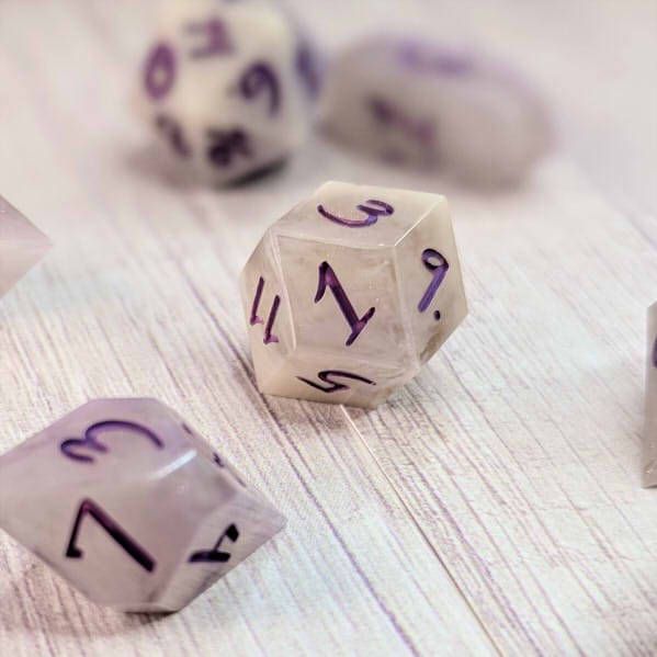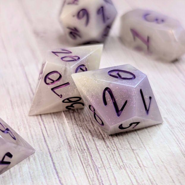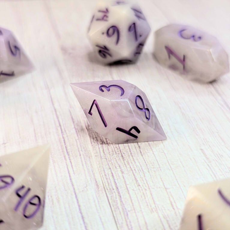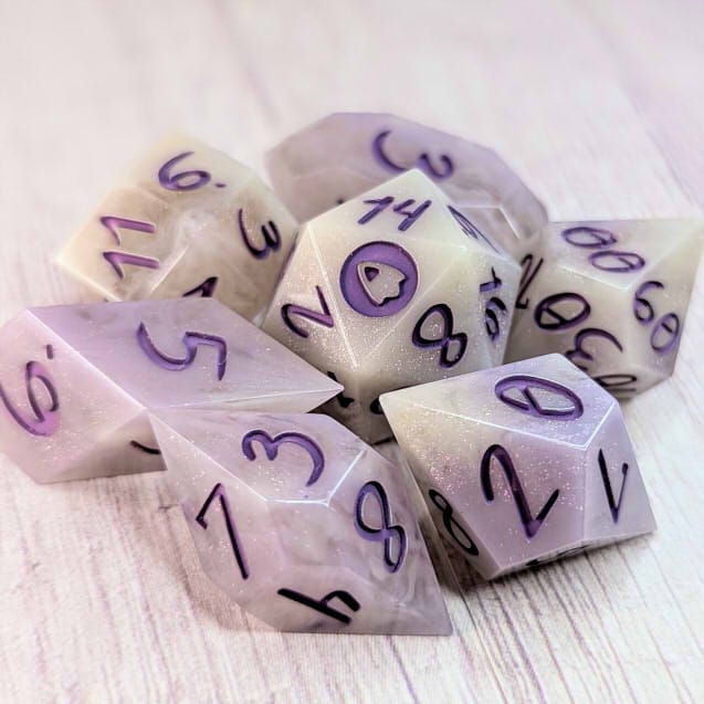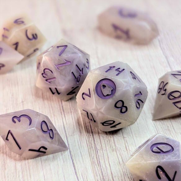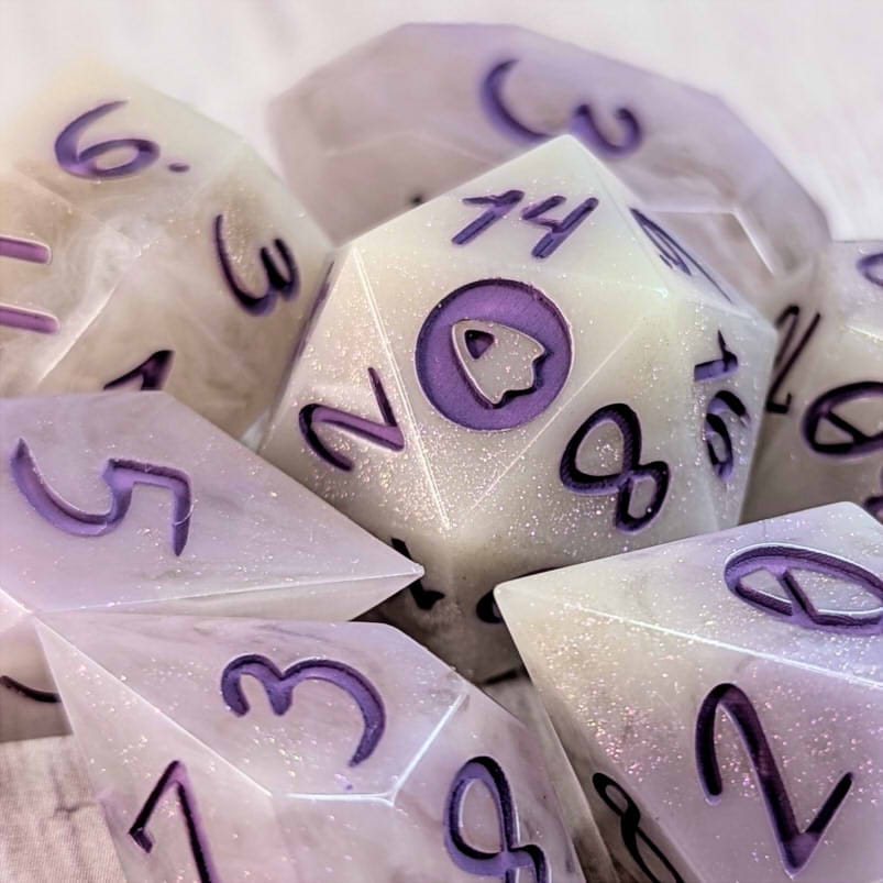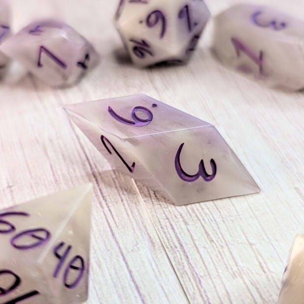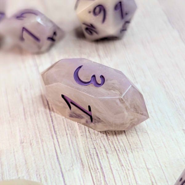 Smoky swirly cream colored dice with portions of purple and streaks of purple shimmer, inked in warm purple.