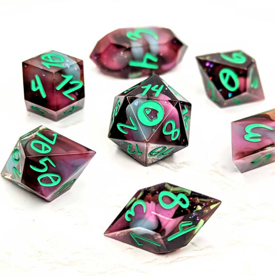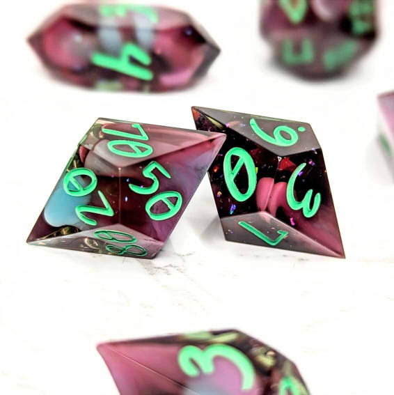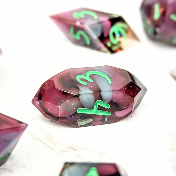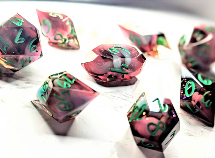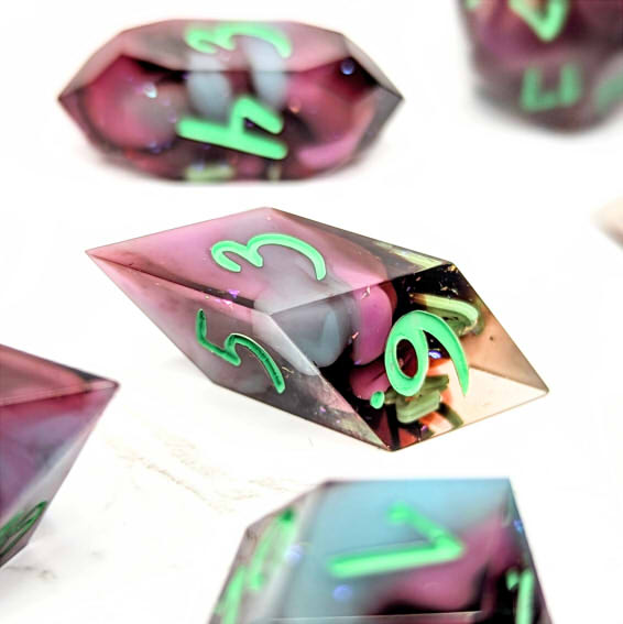 Transparent brown-black dice accented with flashes of colorshift iridescent flakes and pink and blue bloops, inked in teal green.