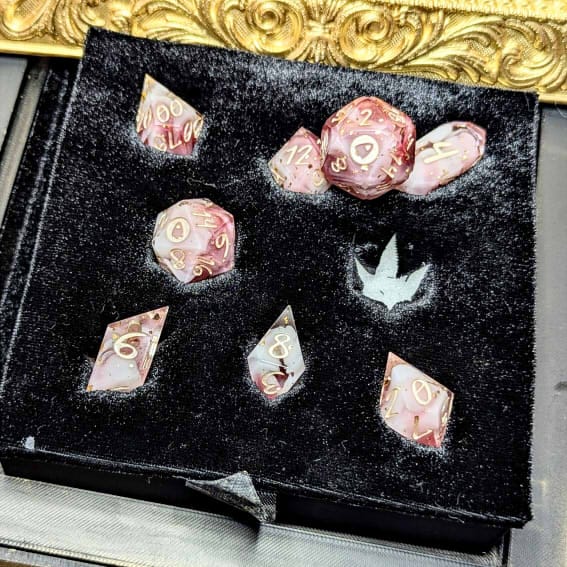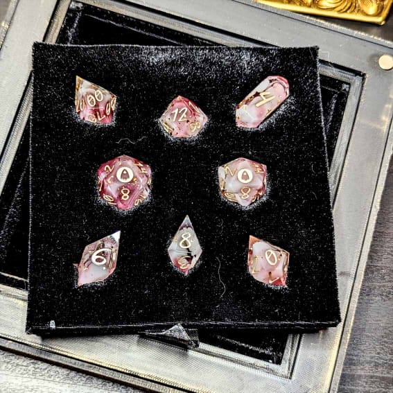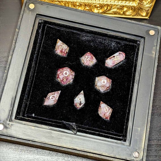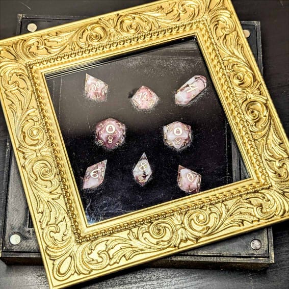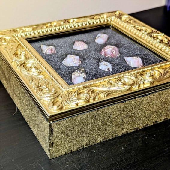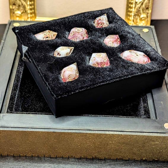 For the elite level dice enthusiast, the solution to the ever-haunting question of dice display has arrived! With the Gh0start Relic Keeper, you can now frame and display your dice sets like the works of art they are. Featuring a 3d printed antique style frame with acrylic window, a removable handmade velvet-lined plush foam insert with cutouts designed to perfectly hold a Gh0start 8pc dice set, and a wooden MDF base with mounting holes and a padded velvet-lined rolling tray. Base and frame attach securely to each other via strong magnets.