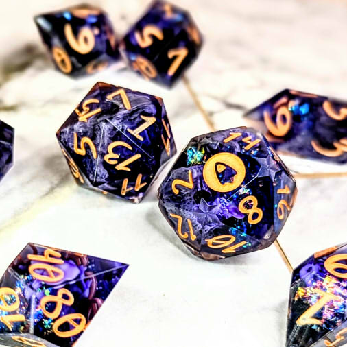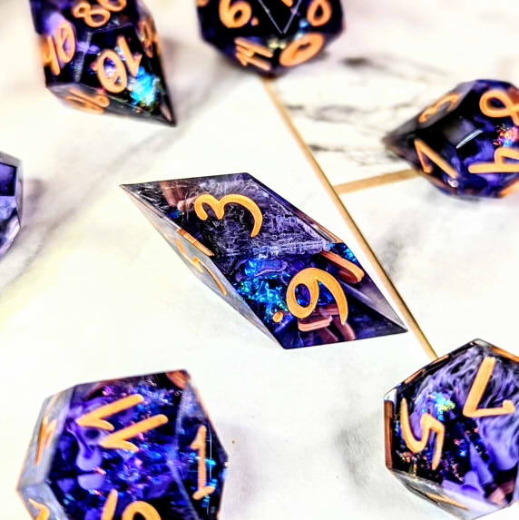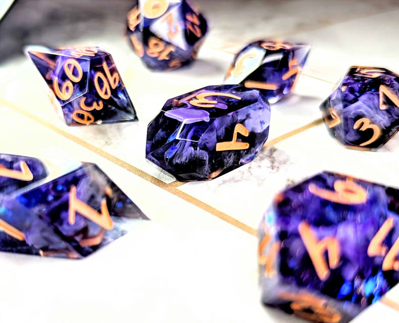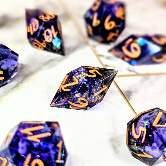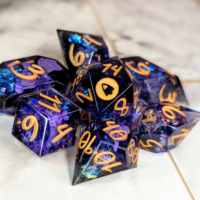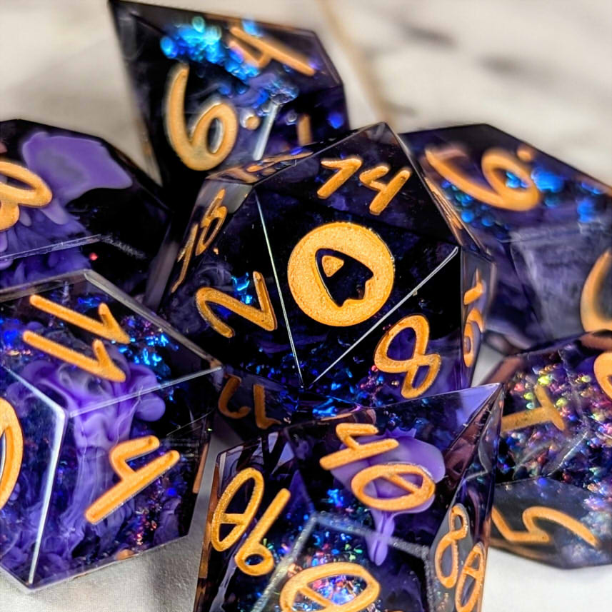 Dark indigo dice with bright multicolor flashes of internal flakes, swirled with dripping clouds of purple, inked in dandelion gold.