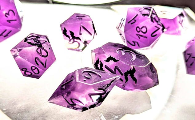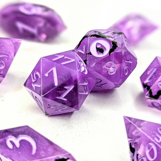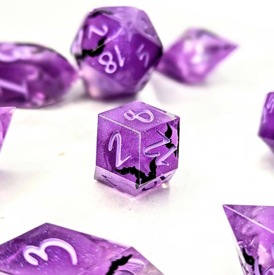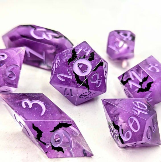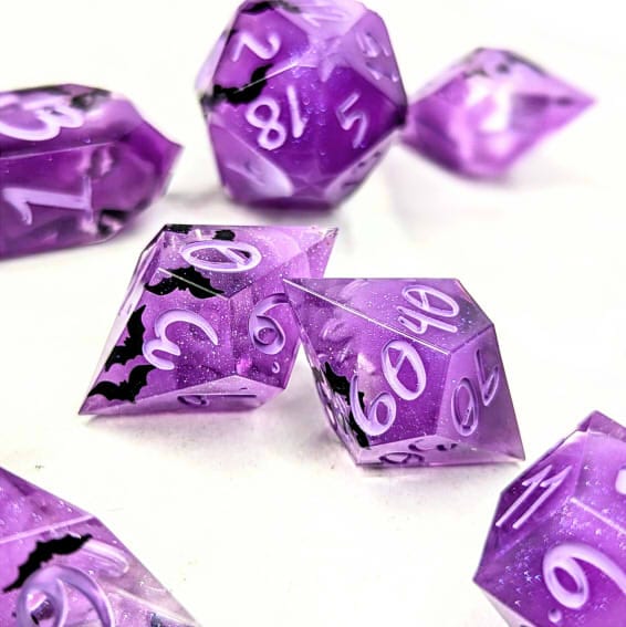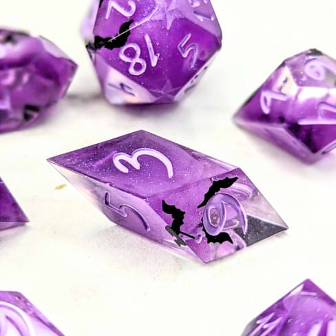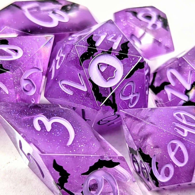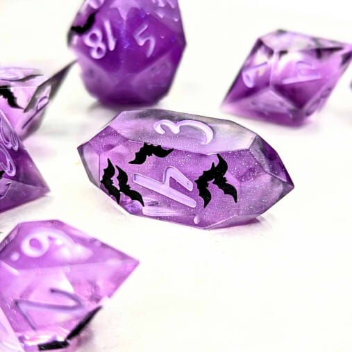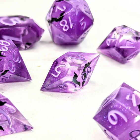Shimmery transparent dice with black bat glitter and purple fog, fading into dark purple bases, inked in light purple.